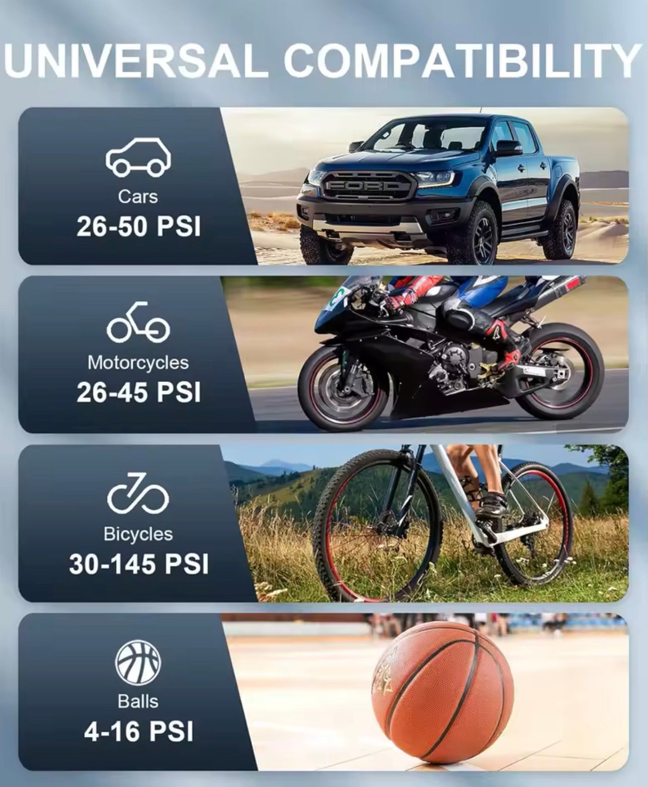 Comes with 3 extra nozzle adapters, perfect for inflating car tires, motorcycle tires, bicycles, SUVs, sports balls, air mattresses, and other inflatables.