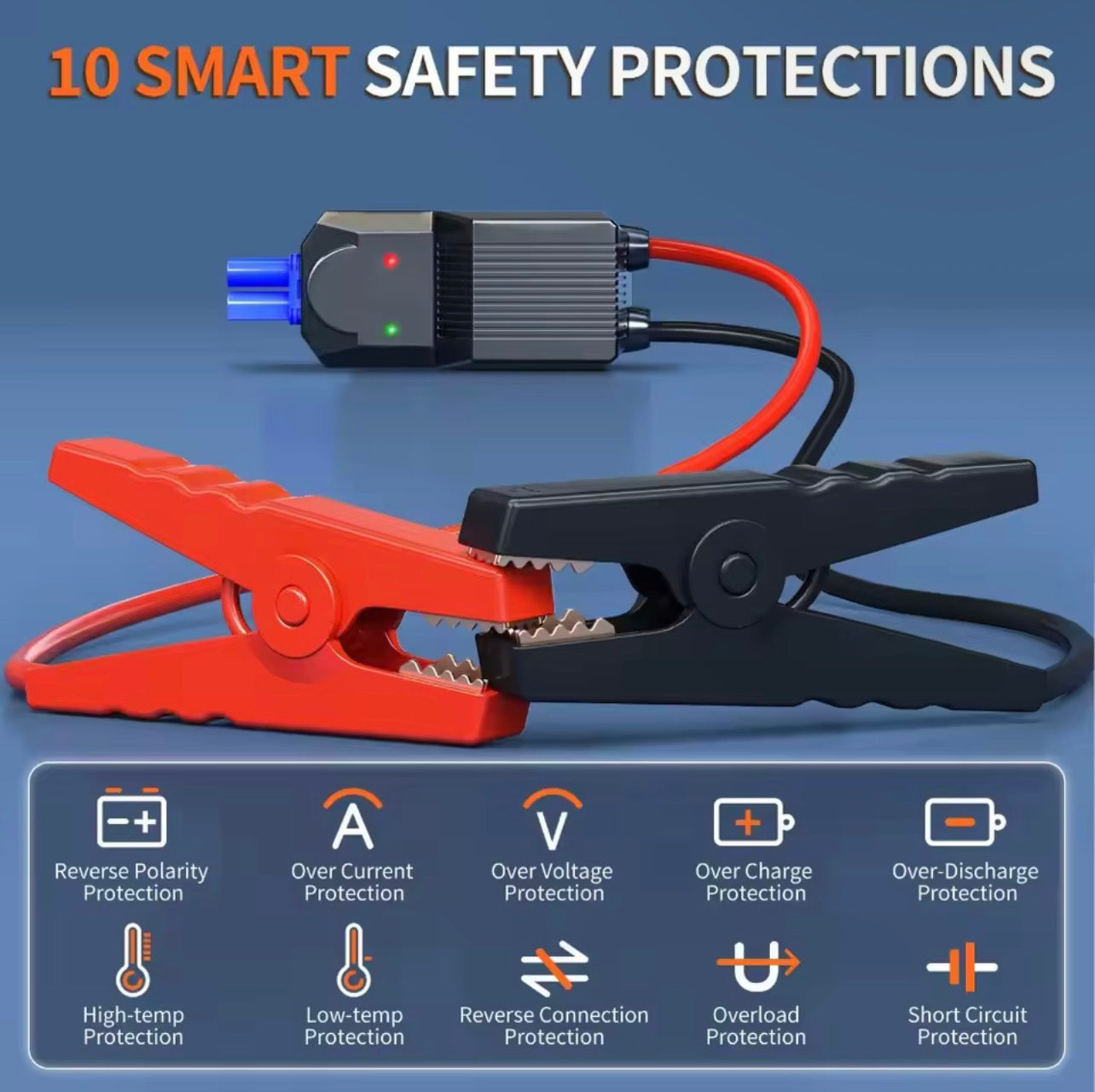 Equipped with intelligent jumper clamps that provide protection against over-current, over-voltage, short-circuit, overload, reverse polarity, and spark-proof operation—keeping you and your vehicle safe at all times.