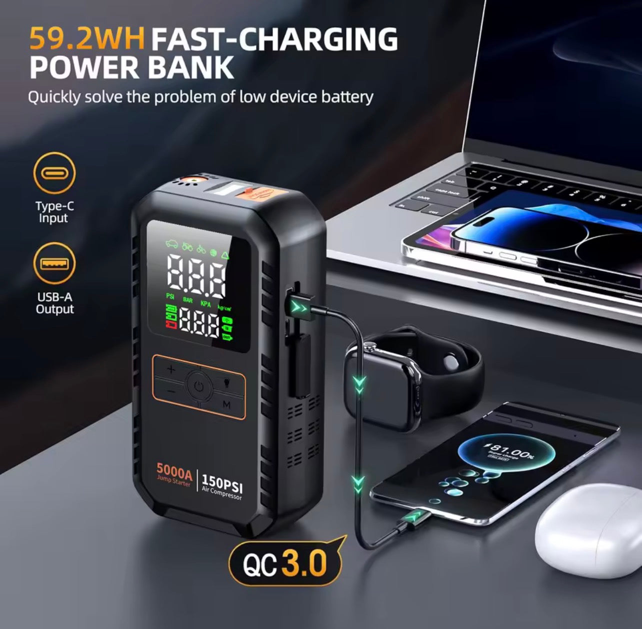 Compact and lightweight design with a high-capacity lithium battery, perfect for carrying in your glove box or emergency kit. Whether you’re on a road trip, camping adventure, or daily commute, this multi-purpose tool ensures you’re always prepared.