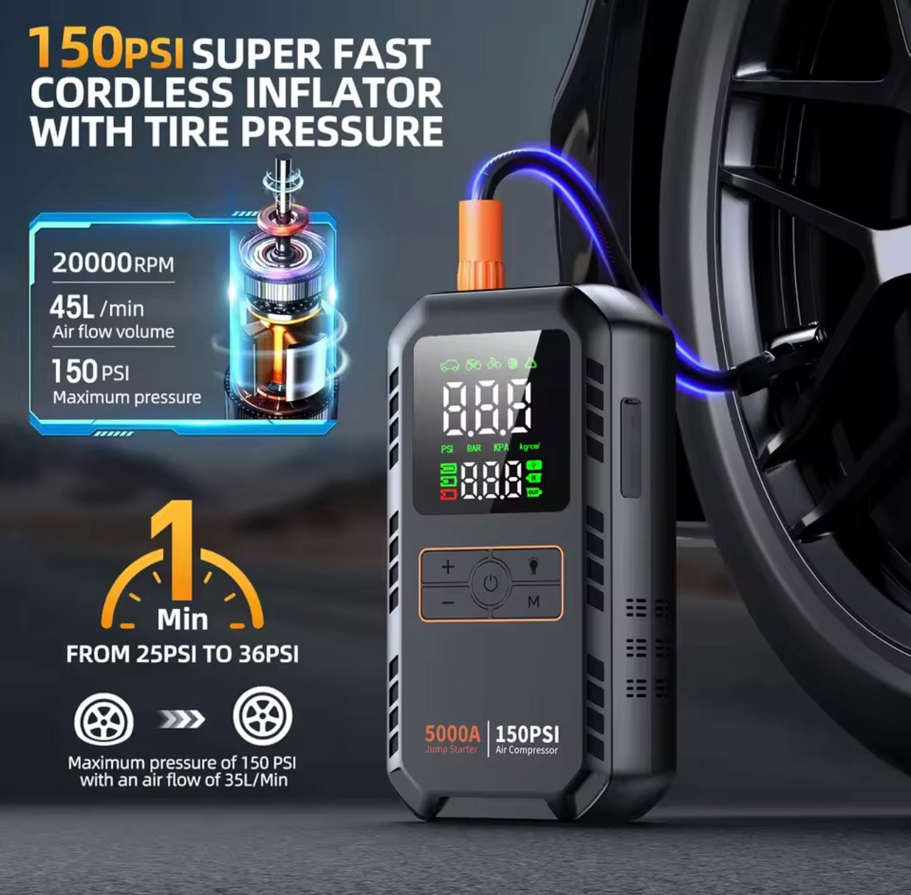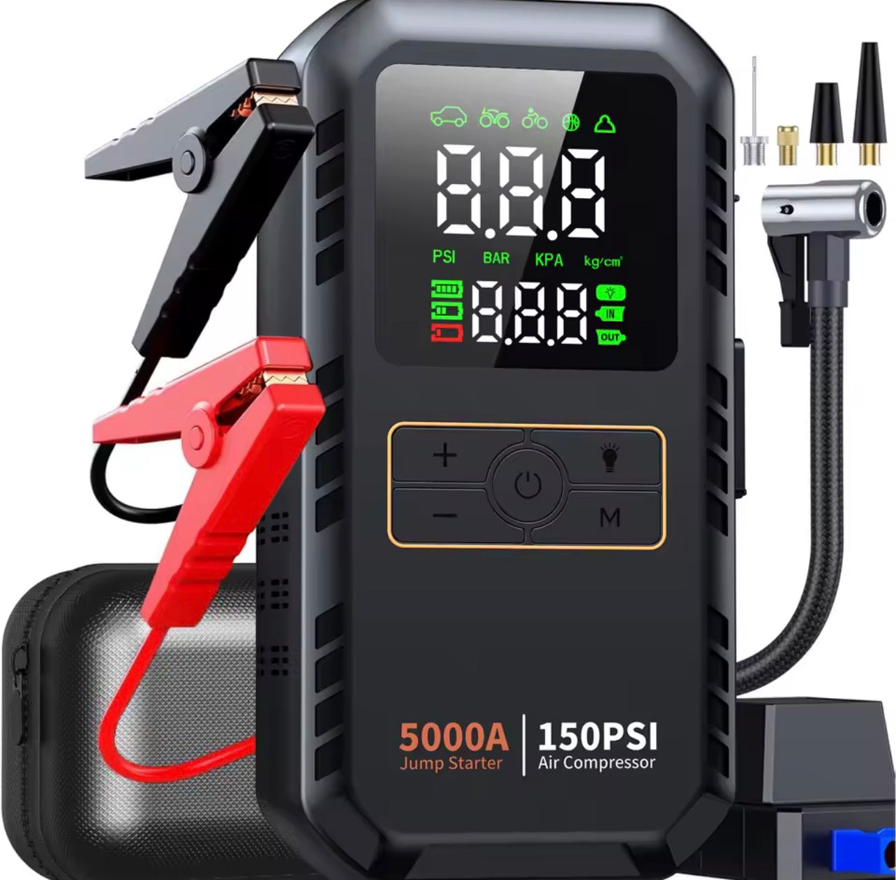 Air Compressor (150 PSI) – Inflate tires, sports equipment, or inflatable items with the built-in digital air pump and pressure gauge for precise inflation.